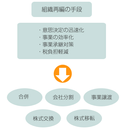 当事務所では、企業再生の手段や意思決定の迅速化、事業の効率化、事業承継対策、税負担軽減などの目的に応じて、最適な組織再編スキームを提案しています。